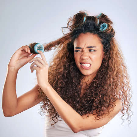 This was supposed to work. Cropped shot of an attractive young woman struggling with hair curlers in studio against a grey background.