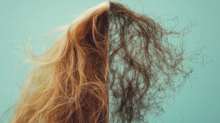 A split view of hair before and after treatment, showing the dramatic difference between dry, damaged strands and sleek, healthy hair.