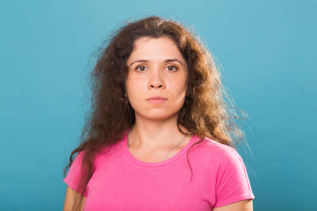 portrait of woman long hair and looking unhappy. Messy hair. Brunette woman with messed hairs. Girl having a bad hair. Bad hairs day.