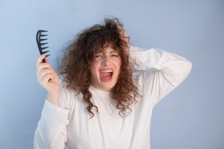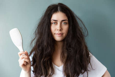 Portrait of a beautiful young woman with tangled brunette hear holding a comb. blue background. The concept of hair care.