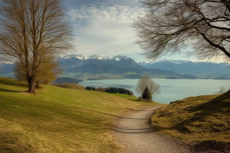 Panoramic view of Swiss Alps and Thun lake, springtime