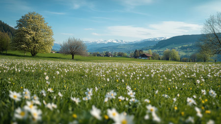 A serene Swiss meadow bursts with colorful spring flowers under a bright blue sky, framed by majestic mountains in the distance.