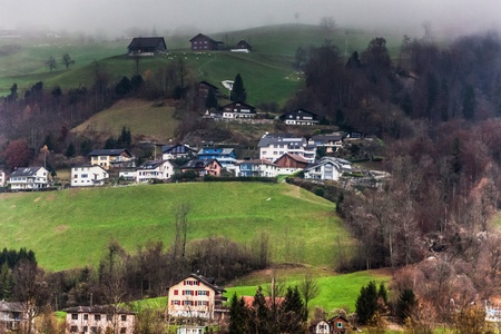 Holiday in Switzerland - Beautiful foggy view of winter landscape towards Engelberg, Switzerland