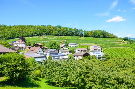 Picturesque Alpine village Spiez in Switzerland with green vineyards on the slopes photographed on a sunny summer day. The small city is located by Thun Lake in Bernese Oberland. Swiss landscape.