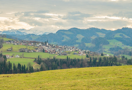 Mogelsberg, Switzerland - December 23rd 2023: View towards the beautiful historic village between hills