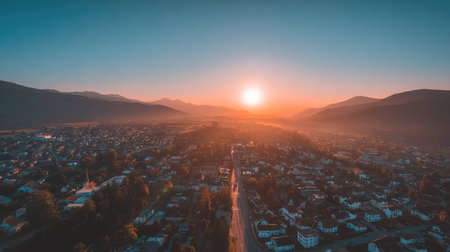 Aerial perspective view on touristic city in the valley surrounded by meadows, forest and rapeseed fields