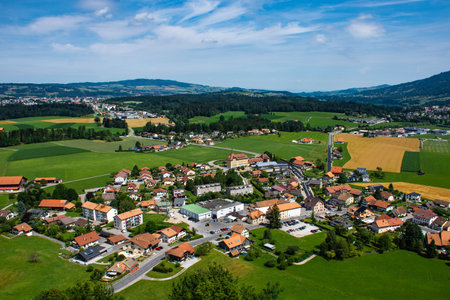 Switzerland aerial view from the plane, green valley, Swiss village