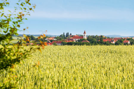 Amazing spring rural landscape with green field, village and blue sky - Czech Republic, Europe
