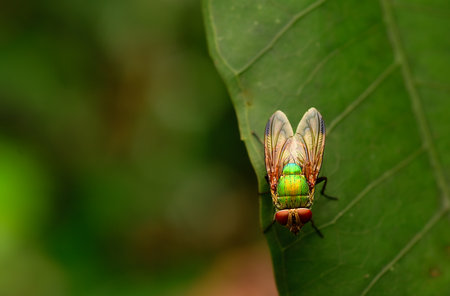 Close-up Stilt-legged fly on green leaf, Beautiful macro shot of Micropezidae.