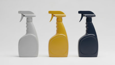 Three cleaning spray bottles isolated on white background
