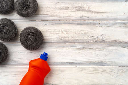 Top view photo of white gel detergent bottle without label and multicolor scouring pads on isolated blue background with blank space