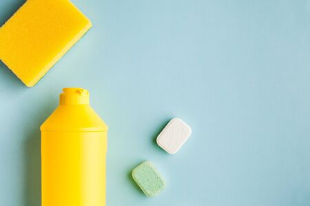 Liquid dishwashing liquid, dishwasher tablets on a blue background. Means for washing dishes. Copy space. Flatlay. High quality photo