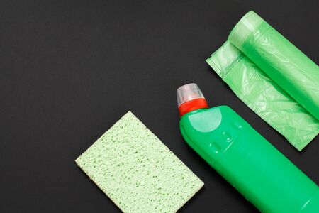 Plastic bottle of washing liquid, a rag and garbage bags on the black background. Top view. Washing and cleaning set.