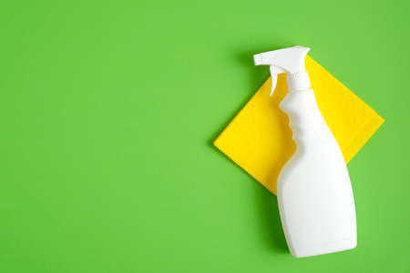 Cleaning spray bottle on yellow napkin over green background. Flat lay, top view. Cleaning services concept.