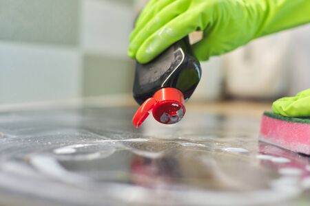 Closeup of hand woman cleaning modern cooking glass ceramic electric surface with sponge and detergent
