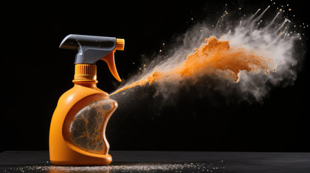 A gloved hand activates a red spray bottle with a yellow nozzle, releasing a fine mist on a black backdrop, perfect for cleaning product ads or sanitation themes.