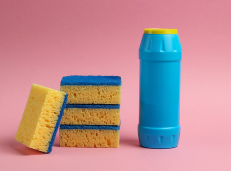 Cleaning concept. Detergent bottle, sponges on pink pastel background