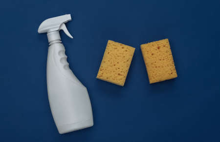 Spray bottle and sponges on classic blue background. Color 2020. House cleaning theme. top view