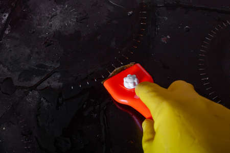 Scraper for cleaning glass ceramics in the hand with rubber glove against the background of a plate with burnt dirt