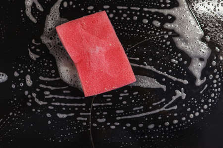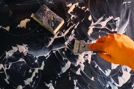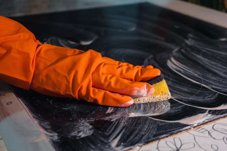 An orange glove with a yellow sponge washes the kitchen hob, watered down with a cleaning agent. Home Cleaning Concept