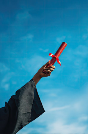 Close-up of hands holding graduation diploma against blue sky, roll paper with a red ribbon, wearing black dress. A hand triumphantly holds a diploma against a blue sky, symbolizing success and aspirations reached. The black gown sleeve and red ribbon add a classic touch of academic achievement.