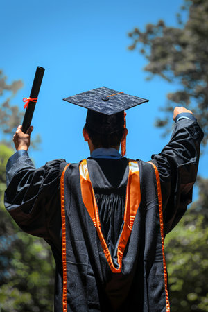 Back view of a graduate with diploma and cap outdoors. Graduation time in educational institutions. With Generative AI technology.
