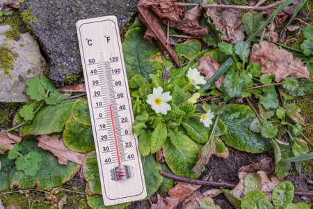 Bush of the blooming Primula vulgaris, also known as common primrose with white flowers and wooden alcohol outdoor thermometer in overcast rainy spring day