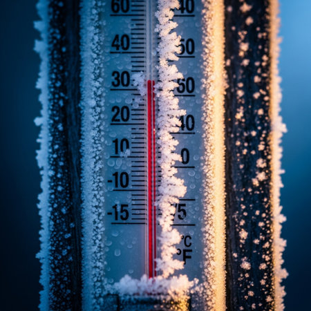 A close up image of an old fashioned temperature gauge showing very cold winter temperatures.