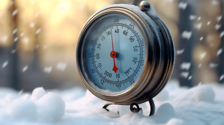 Generative AI : The thermometer lies on the snow in winter showing a negative temperatureMeteorological conditions in a harsh climate in winter with low air and ambient temperature
