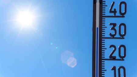 Thermometer displaying high summer temperature on a clear sky background