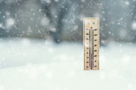 wooden thermometer in snow with freezing temperature