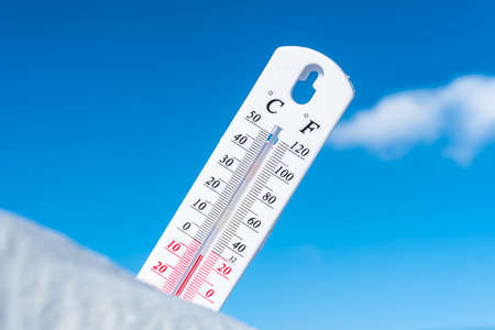 Celsius and Fahrenheit thermometer on the surface of white pure snow. Copy space