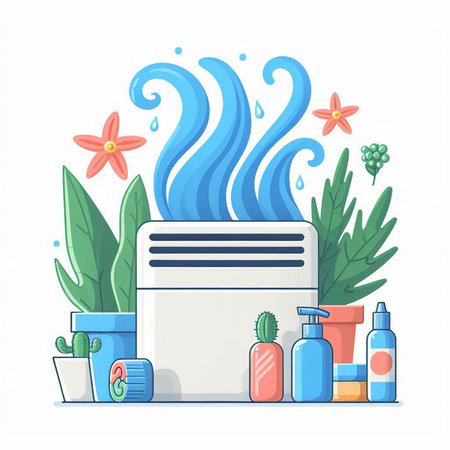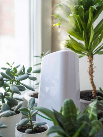 Ultrasonic humidifier among houseplants. Flower pots with succulent plants on windowsill. Water steam moisturizes dry air at home. Electric device for comfort atmosphere in living room.