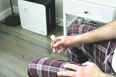 Man holds in his hands a medical hand sanitizer gel for hand. Hygiene corona virus protection. Coronavirus prevention concept. Stay at home, quarantine concept