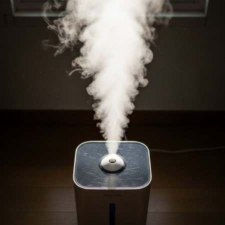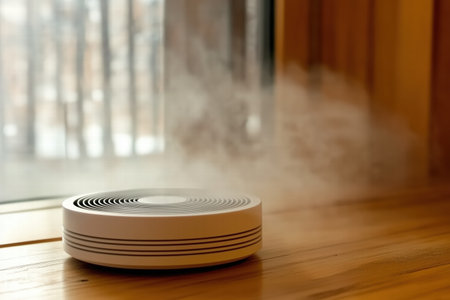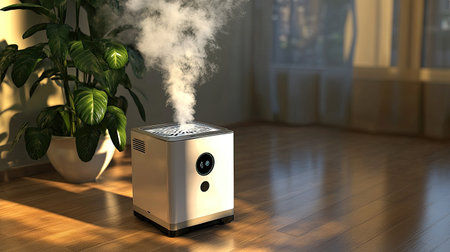A modern device emits steam as it filters air and improves indoor air quality in a cozy room.