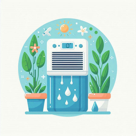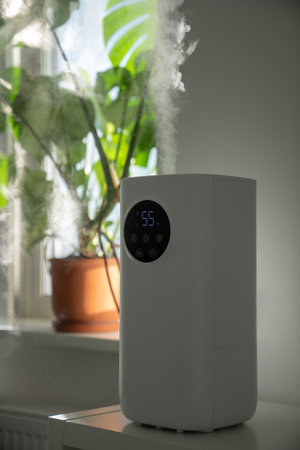 Modern humidifier at home, moistens dry air surrounded by indoor plant. Apartment with moisturizer.