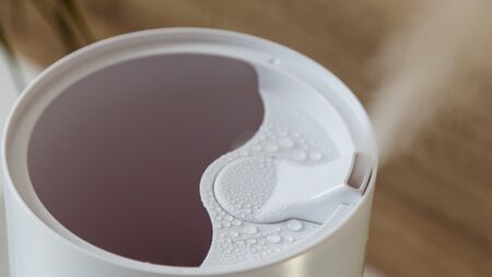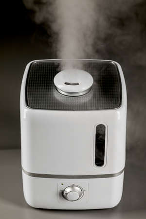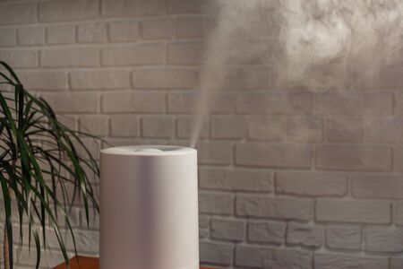 Modern air humidifier on a white wall background. Humidifier spreading steam into the living room