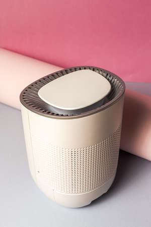 Indoor air purifier of white color close-up on a white background. Dust and allergy cleaner in the house.