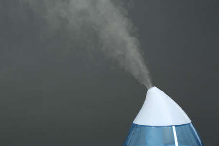 Modern air humidifier on gray background, closeup. Space for text