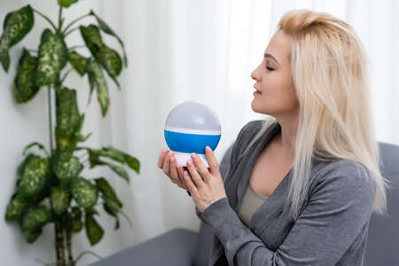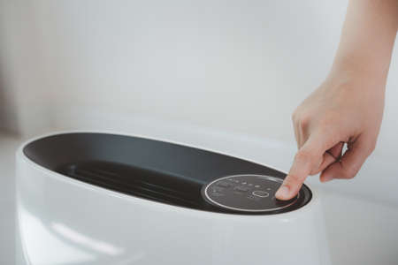 Modern home humidifier and woman hand adjusting button in modern apartment with house plants
