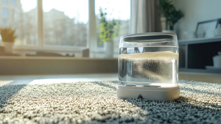 A stunning living room scene featuring a glass water container resting on plush carpet, illuminated by warm sunlight, creating a serene and inviting atmosphere.