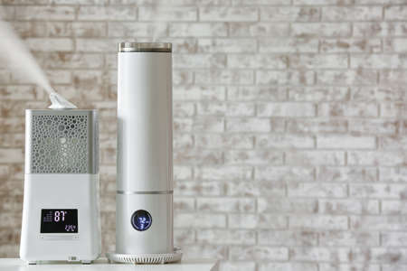 Modern humidifiers on table in room