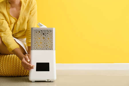 Woman turning on air dryer, purifier, dehumidifier, humidity indicator, air ionizer or water container.