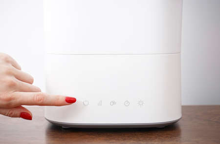Woman switching on modern humidifier on table. Close-up.