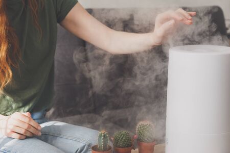 Healthy air. The humidifier distributes steam in the living room. Woman keeps hand over vapor.