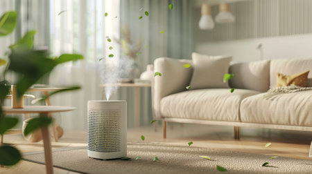 Air purifier ad in living room. Fresh air escapes from the appliance