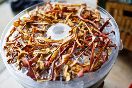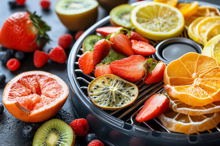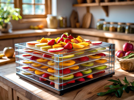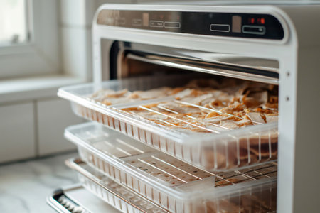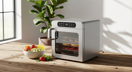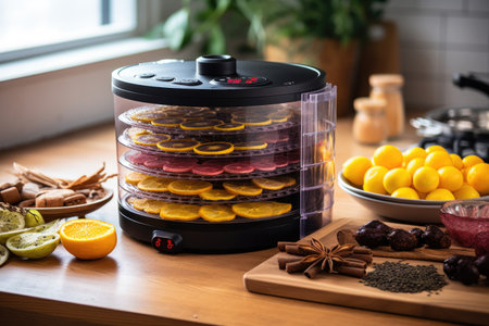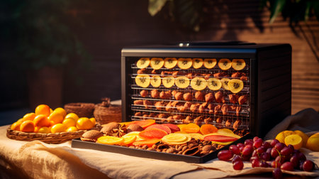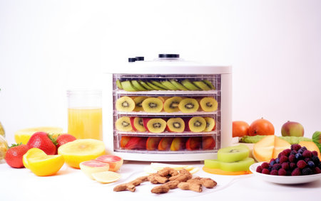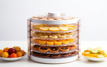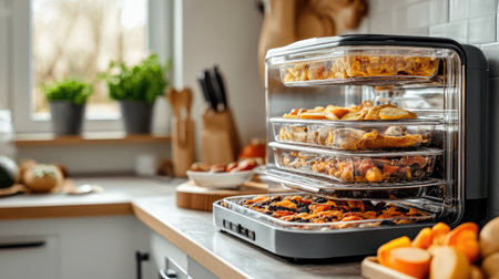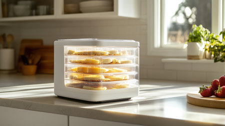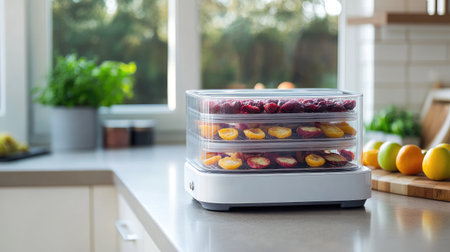 Modern dehydrator in a bright kitchen drinks healthy fruit slices, preserving nutrients naturally. Close up shows benefits of using this appliance at home