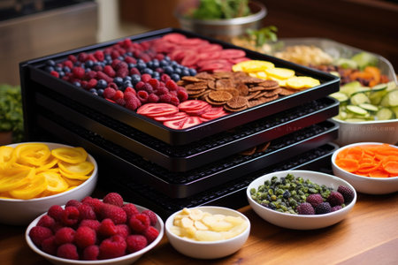 A sleek and modern food dehydrator showcased on a kitchen countertop, filled with a vibrant assortment of fruits and vegetables, perfect for healthy snacking and meal preparation.