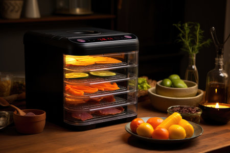 food dehydrator machine with glowing light in a dark kitchen, created with generative ai