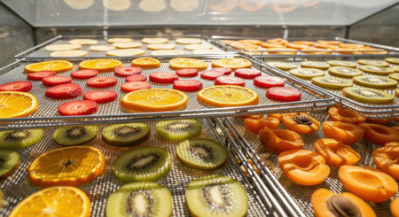 slices of dried fruits in a solar dehydrator, created with generative ai